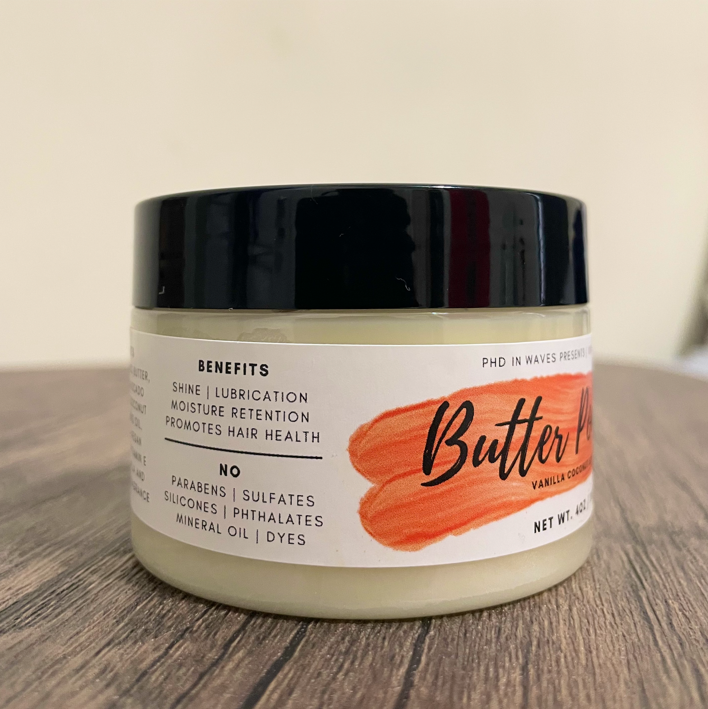 Phd In Waves Butter Pomade is a 100% Natural Alternative To Traditional Grease Based Pomades. We Combined The Benefits of a Hair Butter such as Moisture Retention, Anti-Breakage, and Hair Growth with the Benefits of a Pomade such as Shine, and Hold.